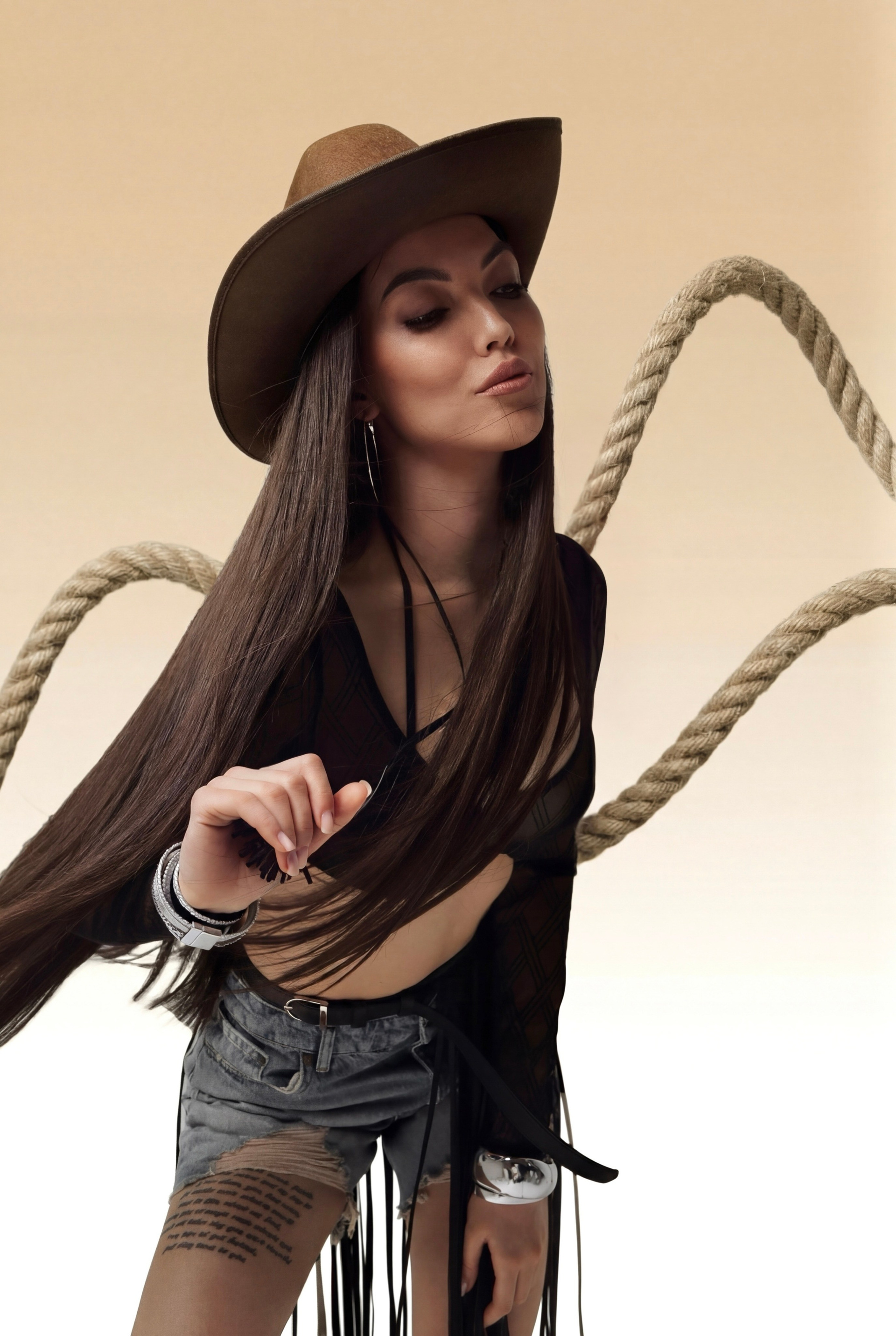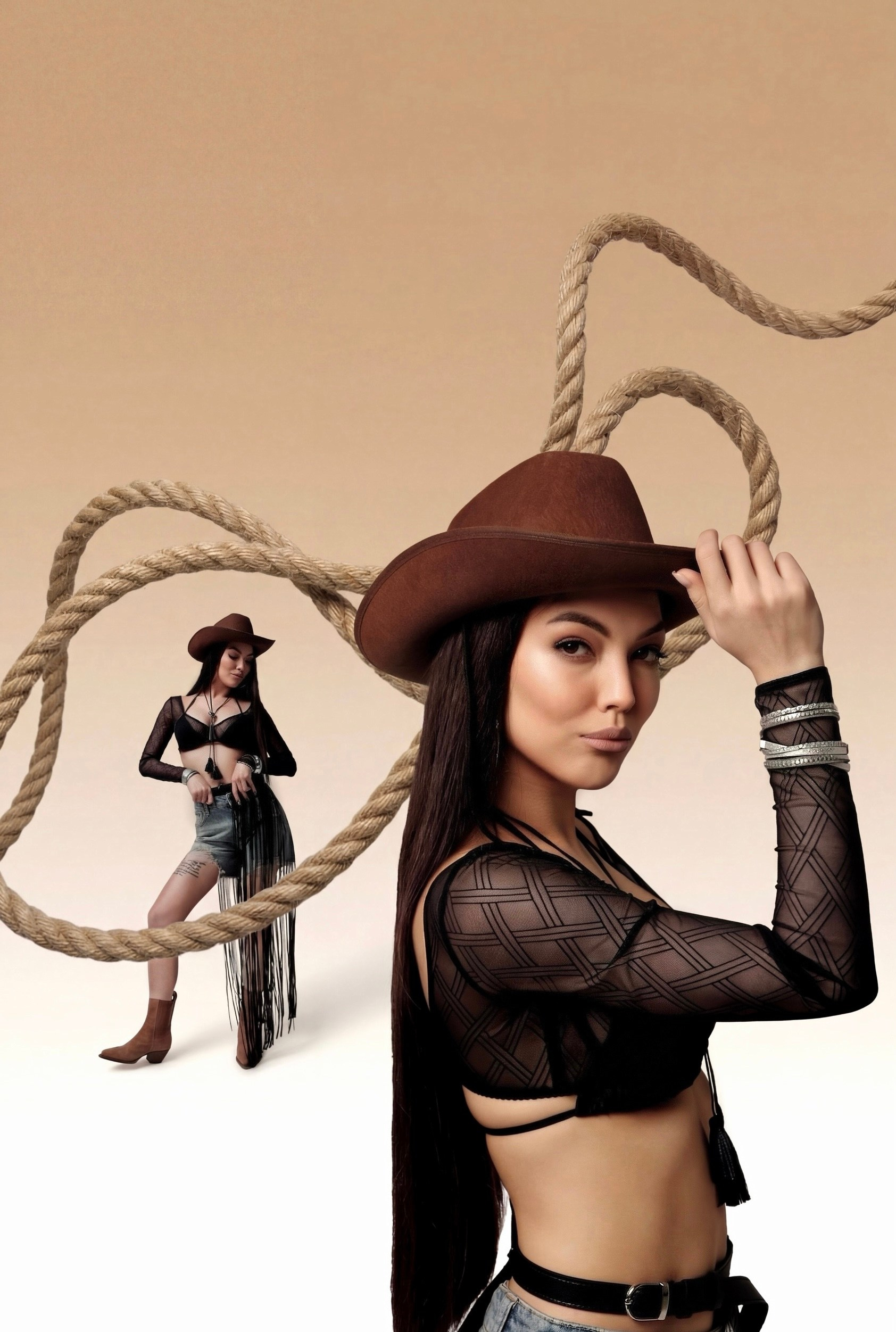 Креативная съемка для Лейсан в ковбойском стиле. Чтобы добиться такого результата была задействована целая съемочная команда из стилиста по одежде и визажиста