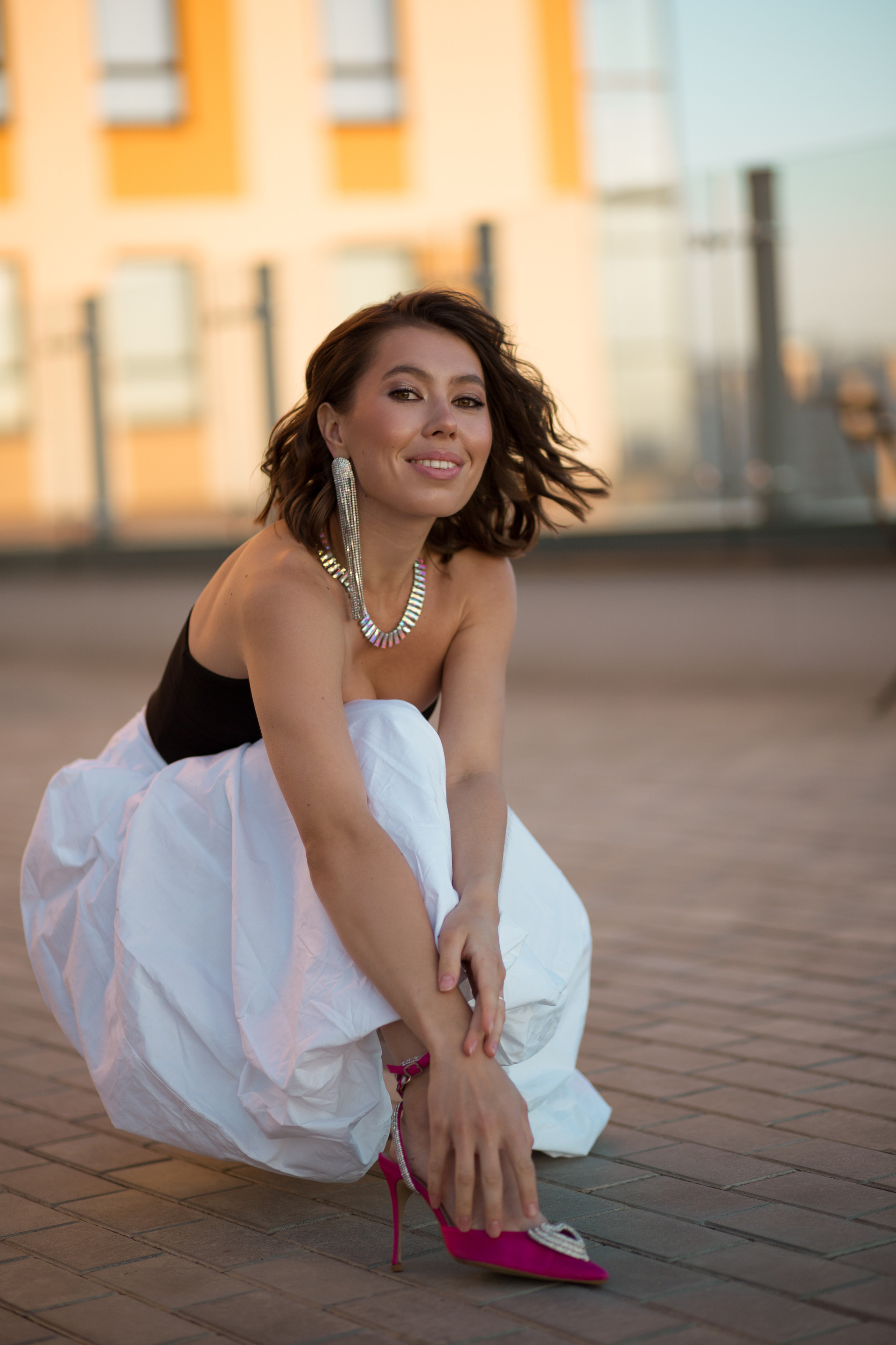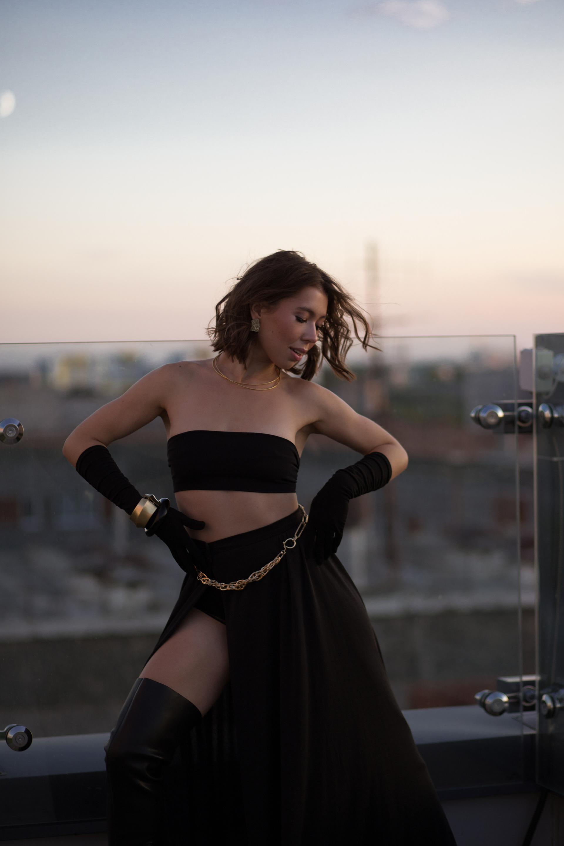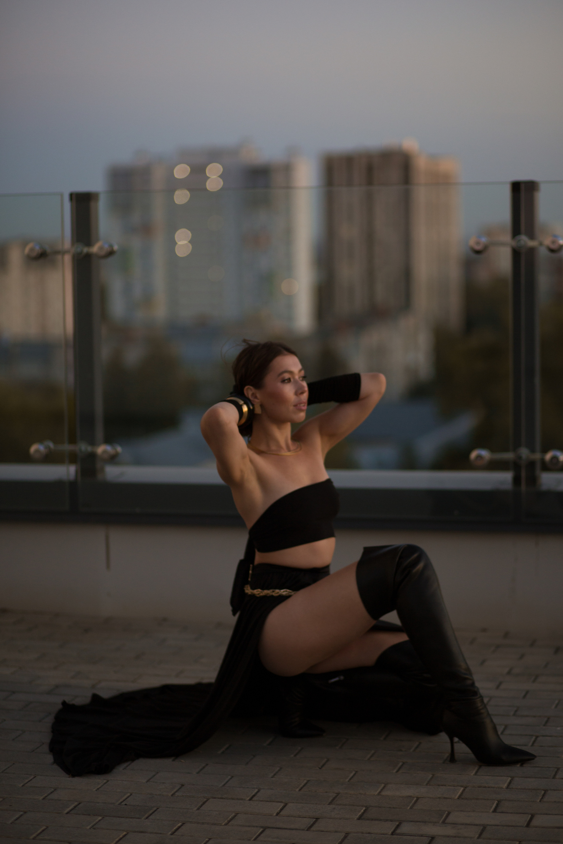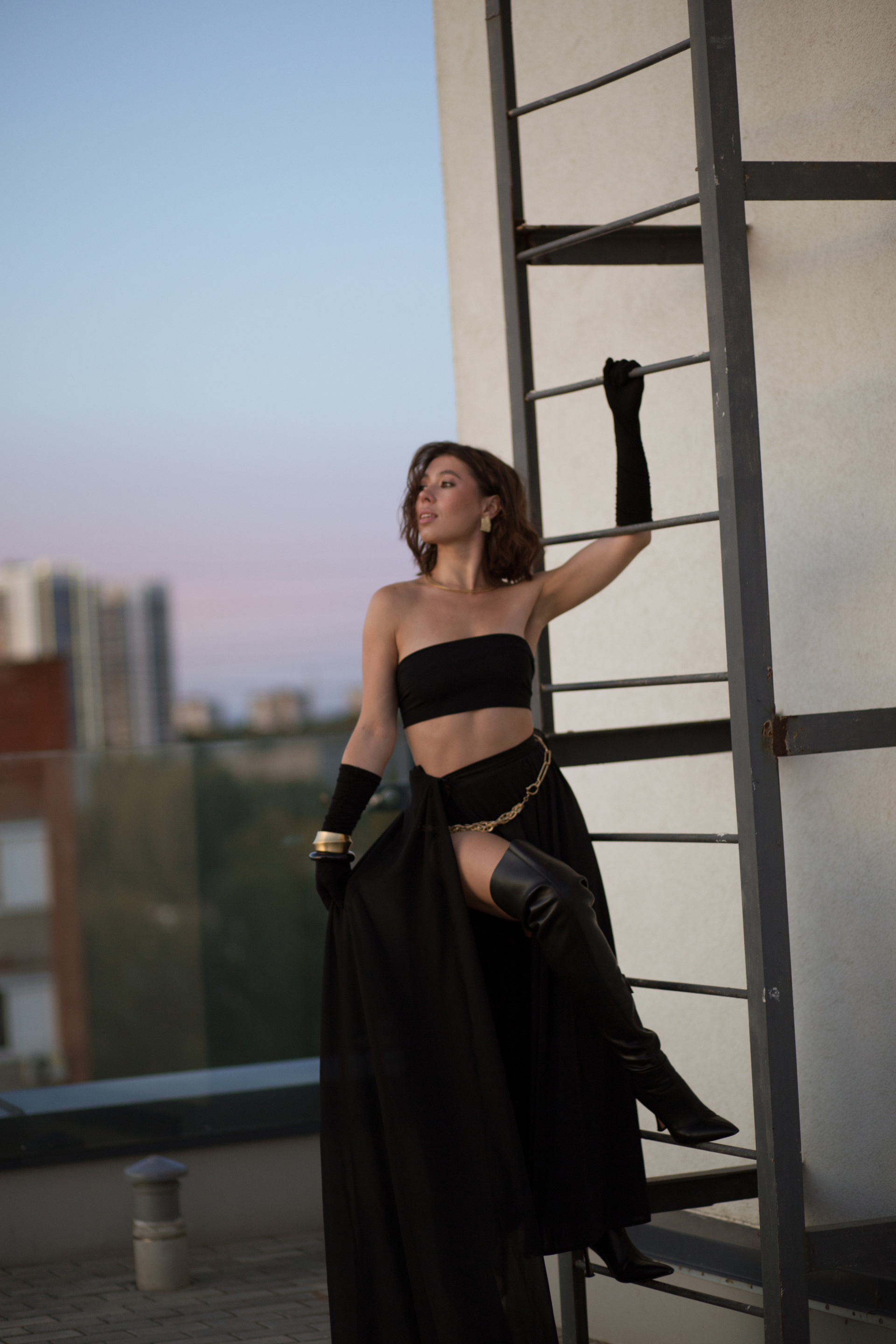 Мы выбрали необычную локацию — крышу одного из жилых домов Ижевска. Стилист предложила контрастные между собой образы — один нежный, с корсетом и юбкой, а второй с кожаными ботфортами и смелым верхом!